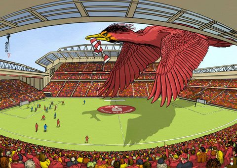 Anifield Globally, Liverpool is known for football and the red Liver Bird that champions Liverpool F.C. Here, with a cheering crowd, the Liver Bird rises with its team, clutching in its beak a supportive scarf rather than the traditional seaweed.