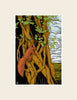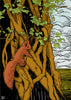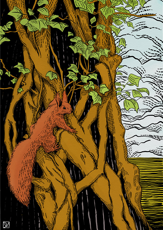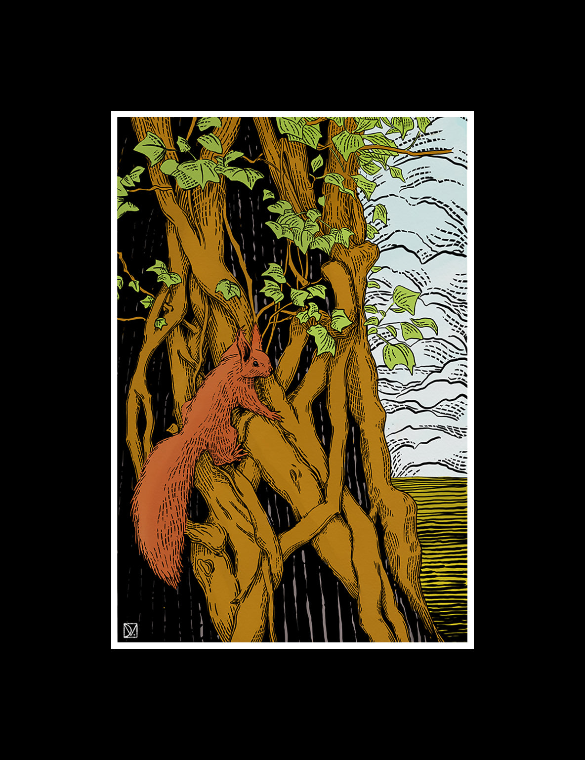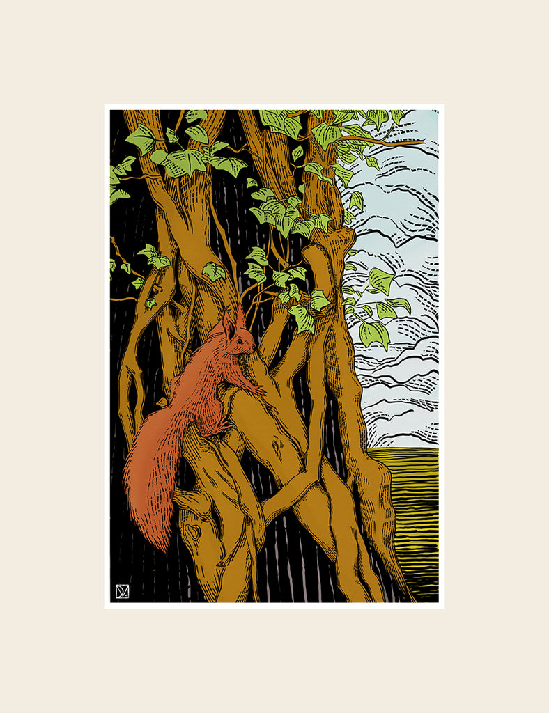 Just north of Liverpool the National Trust maintains Formby’s woodlands, home to a population of red squirrels, helping to protect this adorable native species. Here, rendered as a wood-cut, a squirrel climbs on an ivy-clad oak, with Formby dunes and billowing clouds in the distance. With a background in scientific illustration, David Montagnes has spent the last 25 years working as an ecologist at the University of Liverpool.